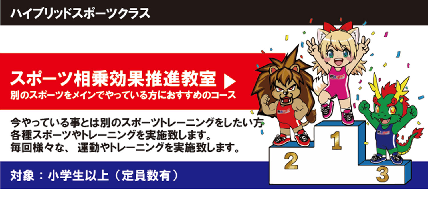体操教室・レスリング教室・トレーニング教室だけでなく、遊戯スポーツや球技やその他スポーツなど色々と実施するマルチ教室となります。