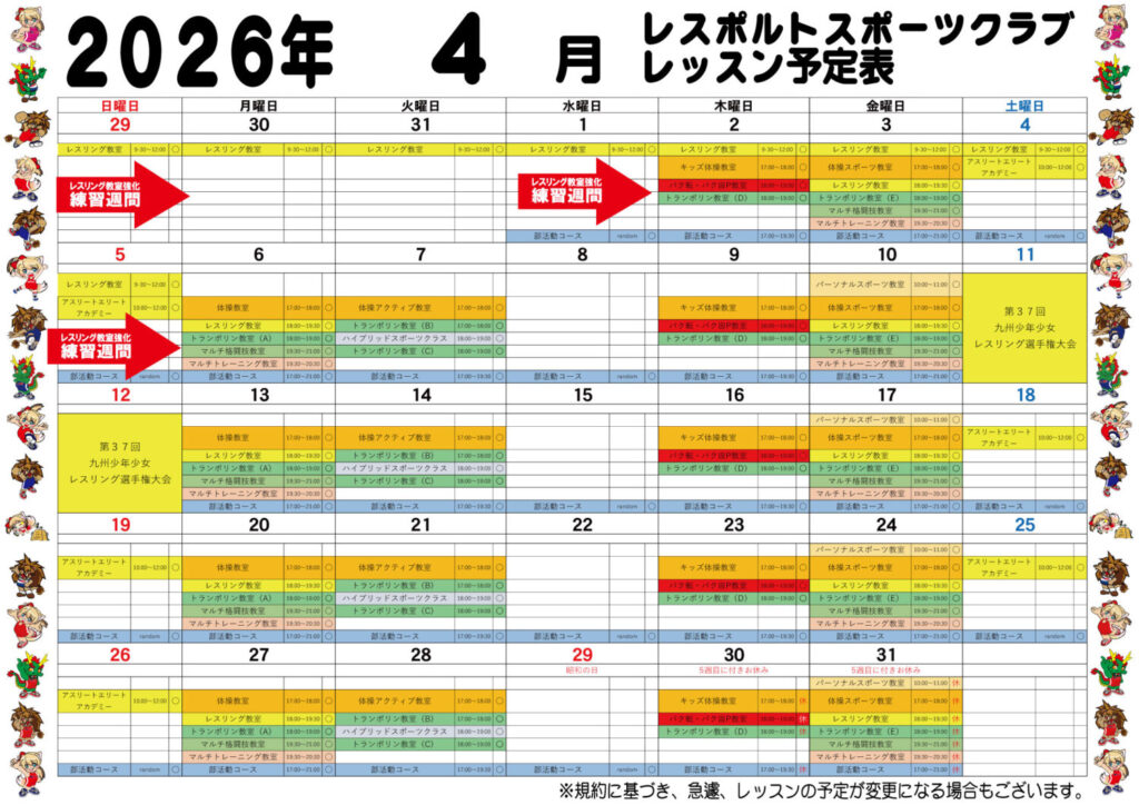 2026年4月のレッスン予定表となりますのでご確認をお願い致します。