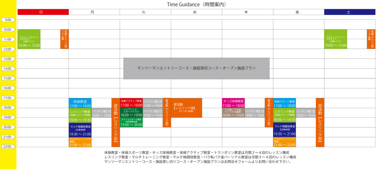 体操教室・レスリング教室・トレーニング教室だけでなく、遊戯スポーツや球技やその他スポーツなど色々と実施するマルチ教室となります。