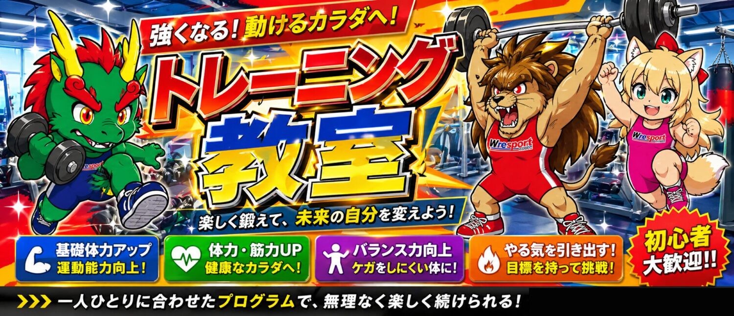 体操教室・レスリング教室・トレーニング教室だけでなく、遊戯スポーツや球技やその他スポーツなど色々と実施するマルチ教室となります。